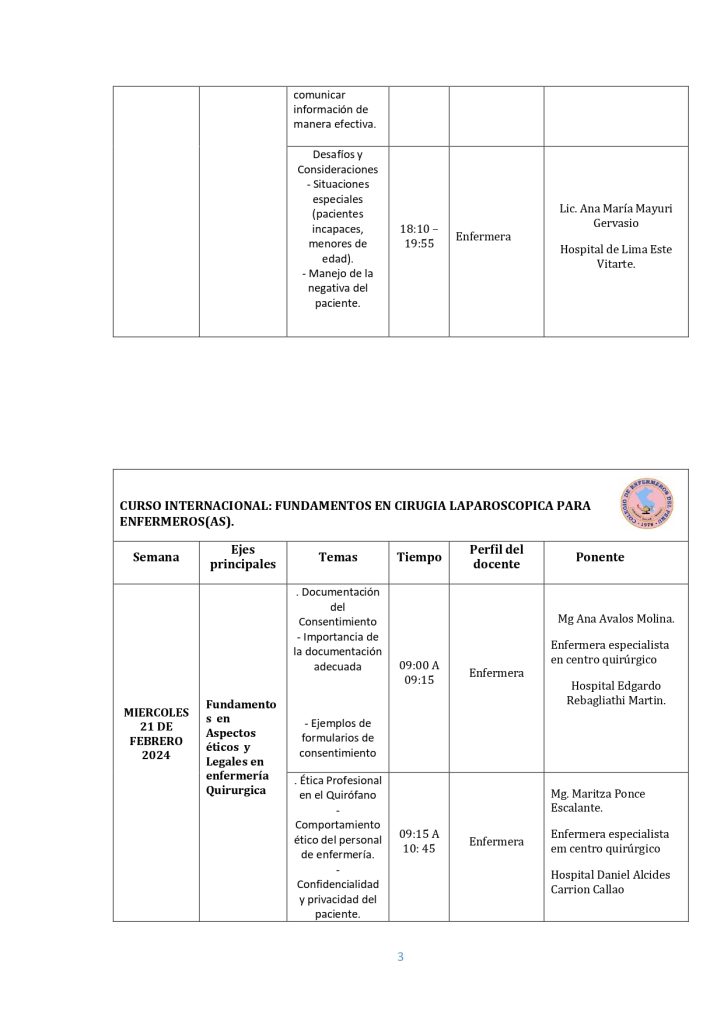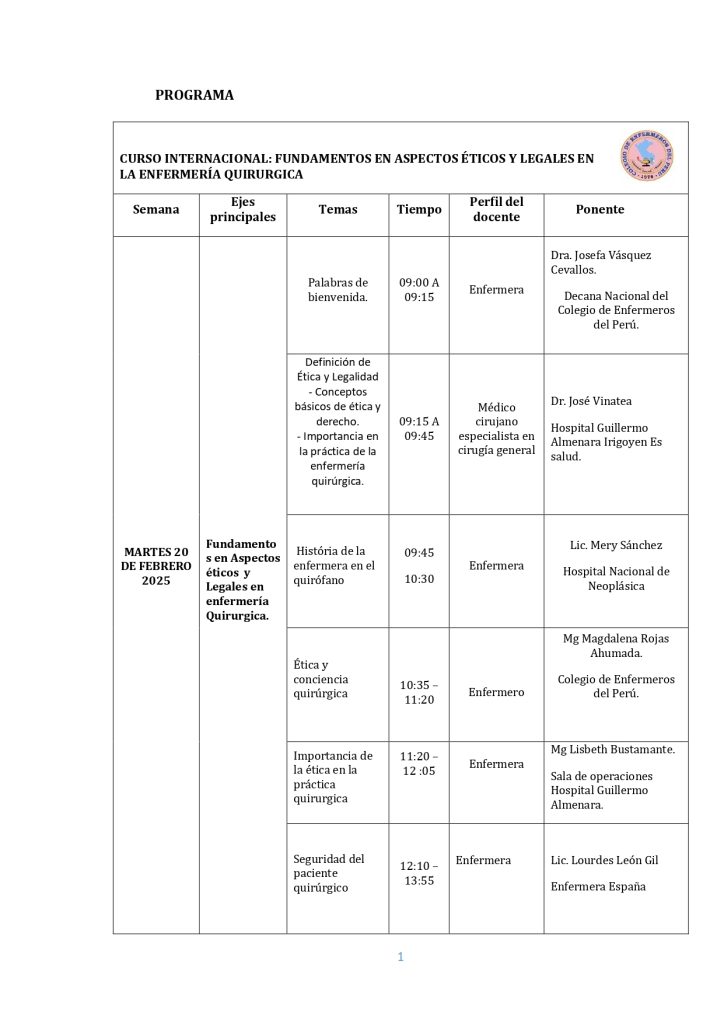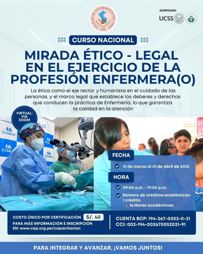 El Colegio De enfermeros Del Perú, en el ejerció de sus atribuciones de asegurar la calidad del desempeño y de fortalecer el desarrollo profesional a los miembros de la orden, ha programado el presente curso Nacional: CURSO INTERNACIONAL: FUNDAMENTOS EN ASPECTOS ÉTICOS Y LEGALES EN LA ENFERMERÍA QUIRURGICA.