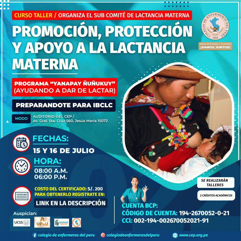 En este contexto, con la finalidad de trasladar a la población la idea principal de la lactancia materna como una práctica importante de salud pública y en el marco de los compromisos nacionales e internacionales de nuestro país en el cumplimiento de los objetivos del desarrollo sostenibles al 2030; El Colegio de Enfermeros del Perú (CEP) y la Sociedad Científica Peruana de Enfermería Neonatal – (SOCIPEN), consideran necesario realizar esta actividad educativa como estrategia de empoderamiento, difusión, capacitación y sensibilización en lactancia materna, de las profesionales de enfermería miembros de la orden a nivel nacional en razón que la enfermera es el miembro de salud que permanece en contacto con la mujer y en todas las etapas de la vida y es el ente principal de cambio en salud pública.