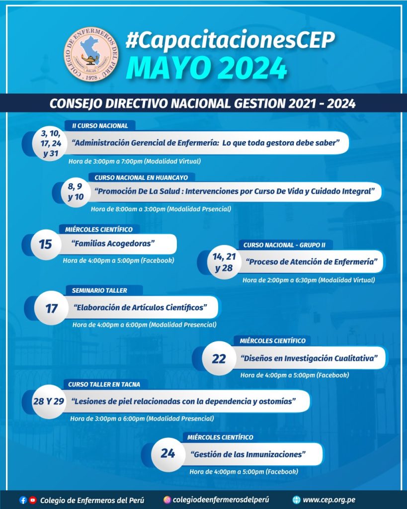 COLEGIO DE ENFERMEROS DEL PERÚ PRESENTA UNA RICA OFERTA DE EVENTOS DE CAPACITACIÓN PARA EL MES DE MAYO