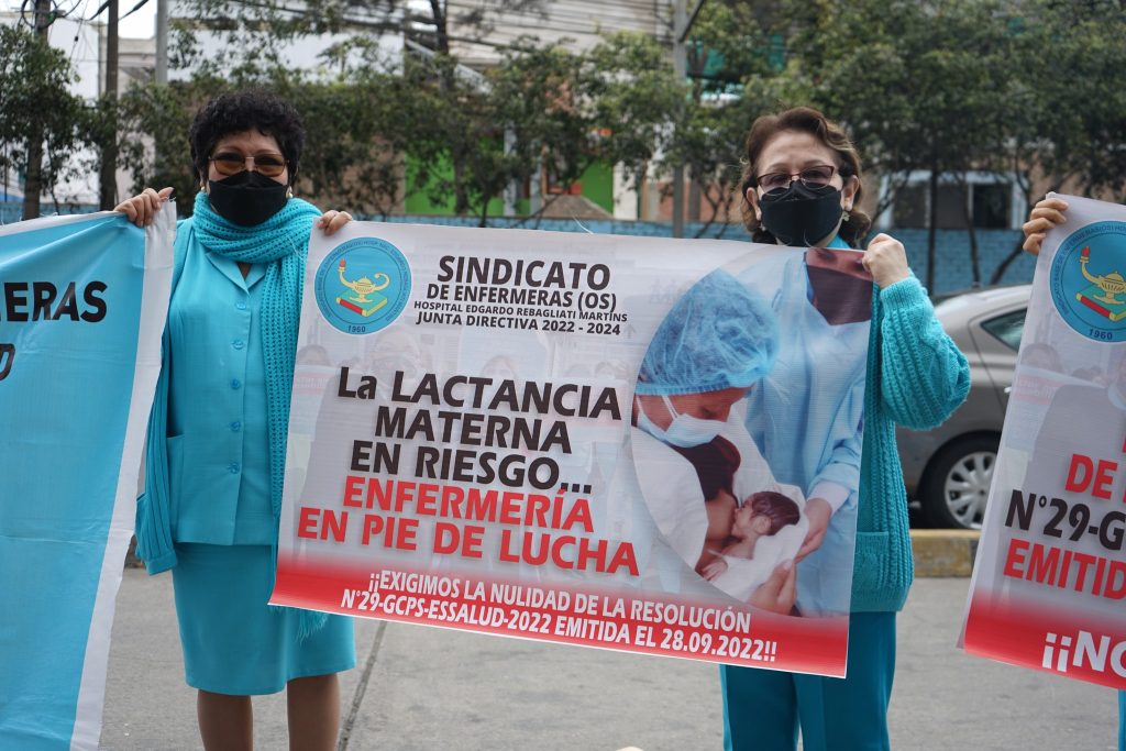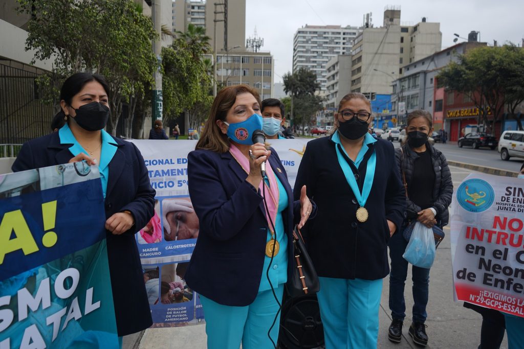 Nuestro Consejo Directivo Nacional del CEP, liderado por la Decana Nacional, Dra. Josefa Vásquez Cevallos en compañía de la vicedecana nacional, Mg. Ana Zúñiga Medina, la secretaria l, Lic. Silvia Neyra Alfaro, la vocal l, Mg. Magdalena Rojas Ahumada y la vocal lV, Mg. Mercedes Morales Pérez estuvieron acompañando a nuestras colegas del servicio neonatal de enfermería y a las representantes del sindicato de enfermería del Hosp. Rebagliati en el plantón realizado en la sede central de Essalud en el distrito de Jesús María.